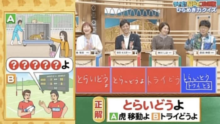 正解は「とらいどうよ(虎、移動よ/トライどうよ)」。鬼奴、柴田、神川の3人が正解!