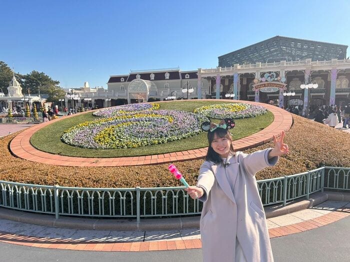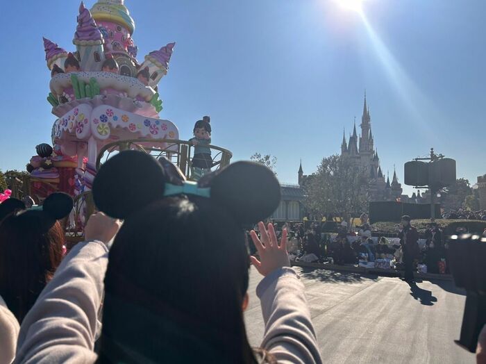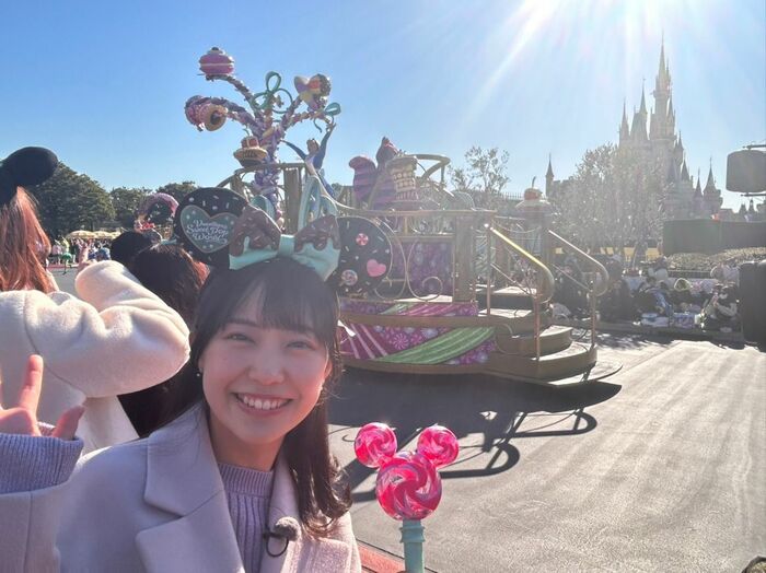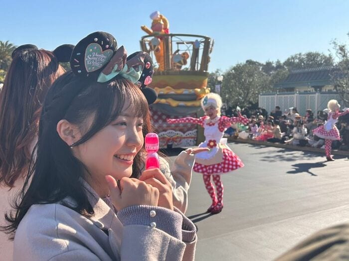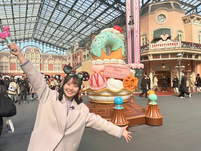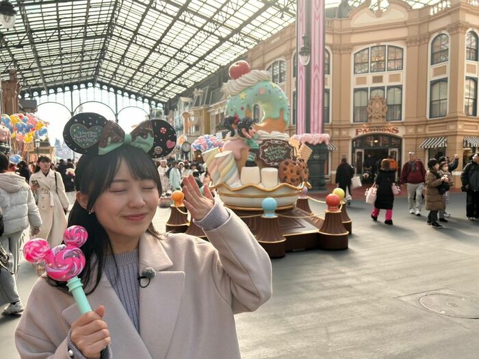 パークの中に入って高崎アナが体験したのは、新たなお昼のパレード『イッツ・ア・スウィーツフルタイム!』。