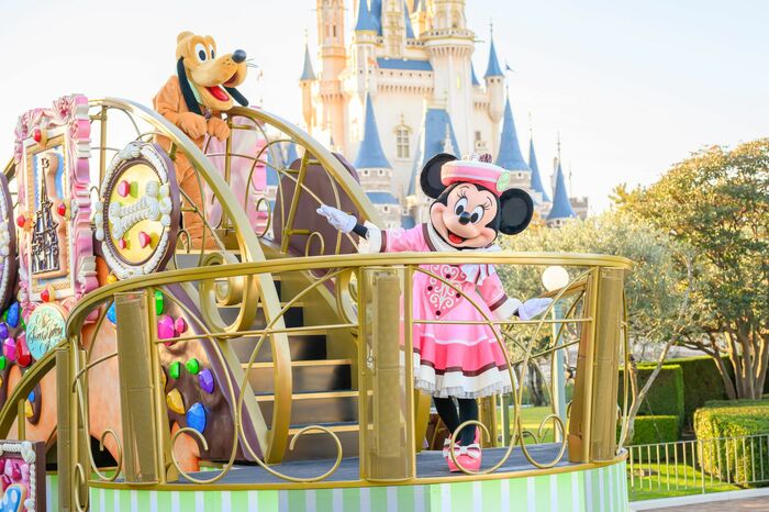 お菓子の絵が飾られているギャラリーをイメージしたフロートに乗るミニーの衣装は、ピンクを基調としたフリルが付いていて、かわいいフロートはもちろんですが、キャラクターたちの衣装にも注目です♪