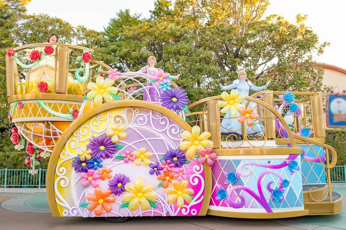 赤いバラや華やかなお花が装飾がされた2台目のフロートには、ベルやラプンツェル、シンデレラが登場。
