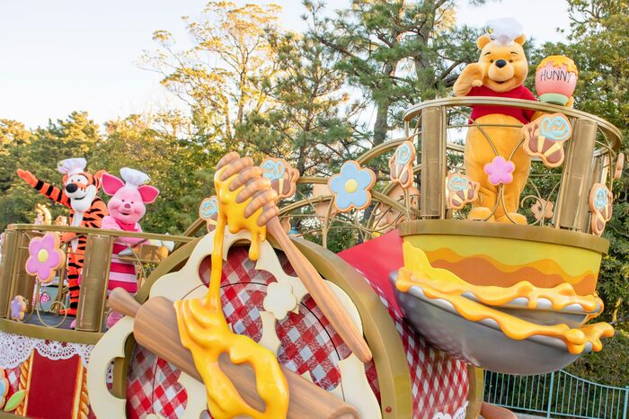 コックの帽子をかぶったプーさんやピグレット、ティガーたちが乗ったフロートも登場。