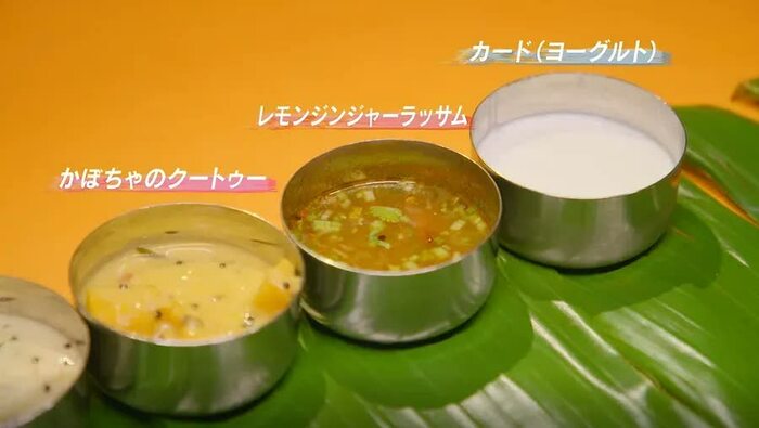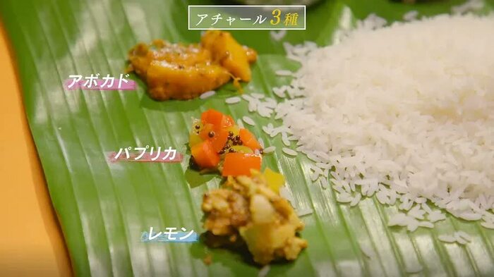 ボス:あとは、ライスの上に数種類のおかずをかけて、混ぜてください。両端のアチャール3種、チャトニ3種は、しょっぱいゾーン。一番しょっぱいのは、アチャール3種。これが加わることで、隠れていた味が前に出ます。だから、しょぱいものとしょっぱいものを混ぜると大失敗。薄い味のものと薄い味のものを混ぜても、あまり味が前に出てこないので、この両サイドをうまく使ってください。