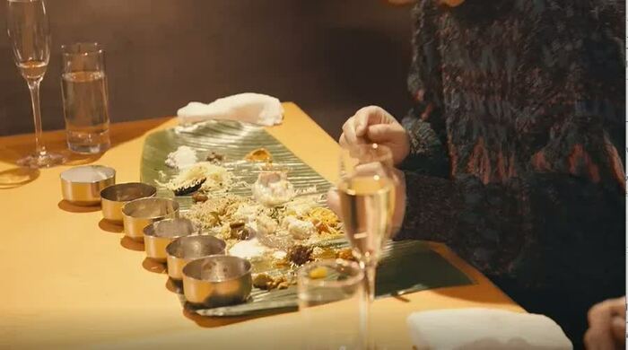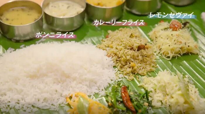 ボス:説明しよう。サンバル、ダール、パイナップルのカーラン。カボチャのクートゥー、レモンジンジャーラッサム。カード(ヨーグルト)、ポンニライス、カレーリーフライス、レモンセヴァイ。