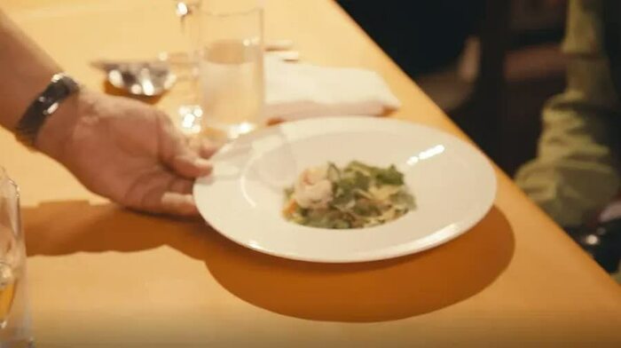 ボス:タイ料理に近いです。日本人はパクチーが苦手な人も多いけれど、東南アジア、南アジアを含めて、パクチーが苦手なのは、実は日本人だけなんです。ひょっとしたらパクチーを嫌いな僕たちが異常ではないかということに気付かなければいけないと思ったんです。今日の料理には、パクチーは3段階で使ってます。火の入れ方が違って、すごく熱いオイルの中に入れたものと、麺とからめたものと、最後にトッピングしたもの。そこで、パクチーが柔らかくなっているという仕掛けがあります。