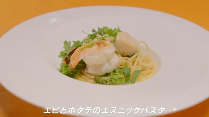本日の料理 2品目「エビとホタテのエスニックパスタ」