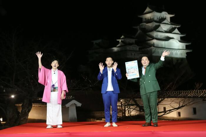 内海は「生配信で漫才する必要あります?プレッシャーかかりますよ。姫路城をバックに!無観客って聞いてましたけど(周りに)姫路市のえらいかたがいそうな感じで」と緊張しながらも、「うれしいです。姫路に貢献できているのが」と感謝を述べた。
