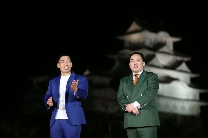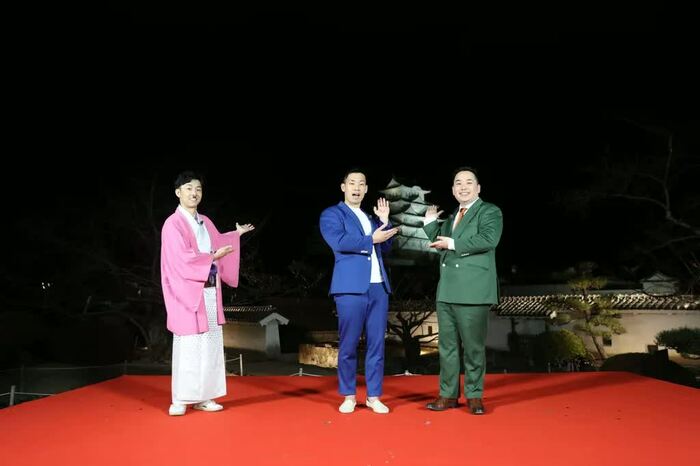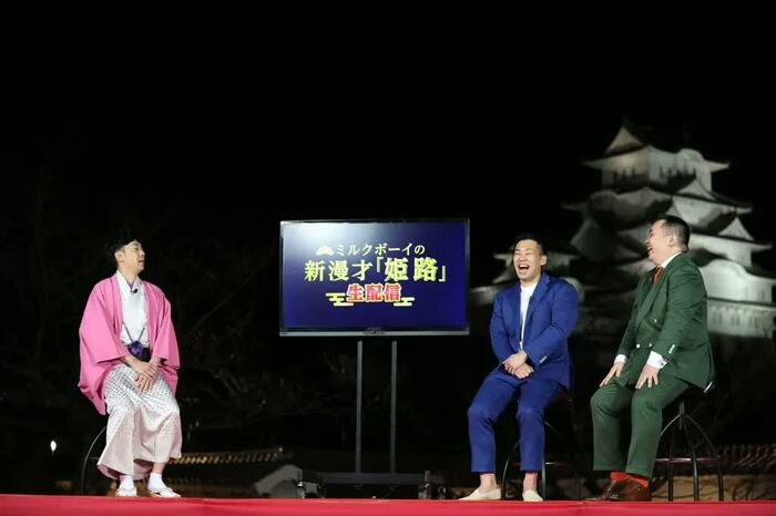 3月1日(月)、お笑い芸人のミルクボーイ(内海崇、駒場孝)が姫路城の西の丸にて無観客の生配信ライブイベントを行った。