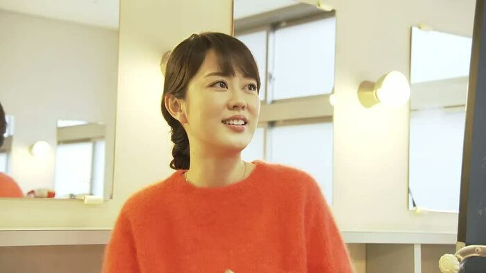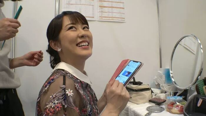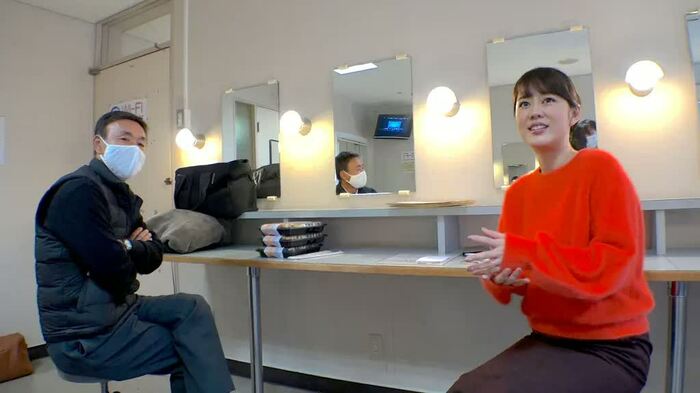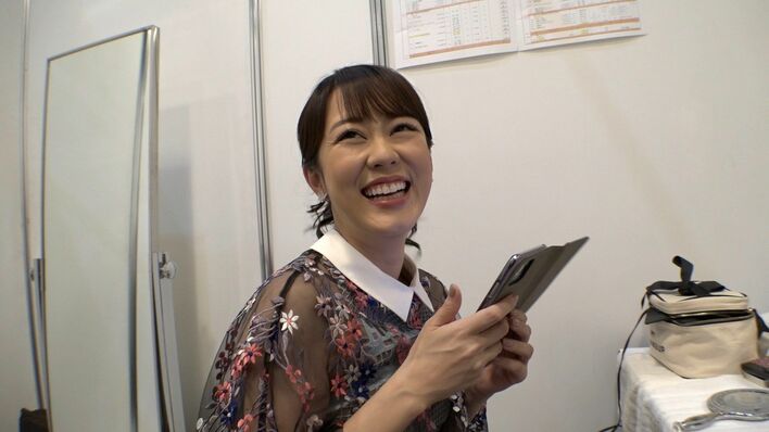 彼女は、落ち着いた柄と華やかな柄の着物のどちらにするか迷っていた。「遠くから見てみよう」と、廊下の離れた場所から見比べ、観客からどのように見えるのか確認。それでも悩み、密着スタッフへ「どっちがいいと思います?」と意見を求め、笑ってみせた。