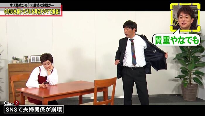 Case②の再現ドラマでは、妻役に大竹しのぶさんのそっくりさん(中垣みなさん)。そこへ「ただいま」と、夫役の明石家さんま(原口あきまさ)さんが帰宅しました。
