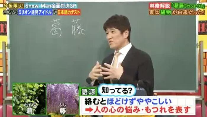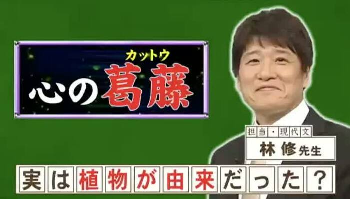 漢字を書く問題で出題された「葛藤」の由来について教えてくれたのは、林修先生だ。「葛藤」とは、「(人の関係などの)もつれ」「(心の中で)思い悩むこと」を表す言葉だ。
