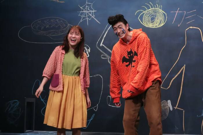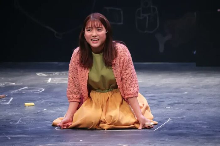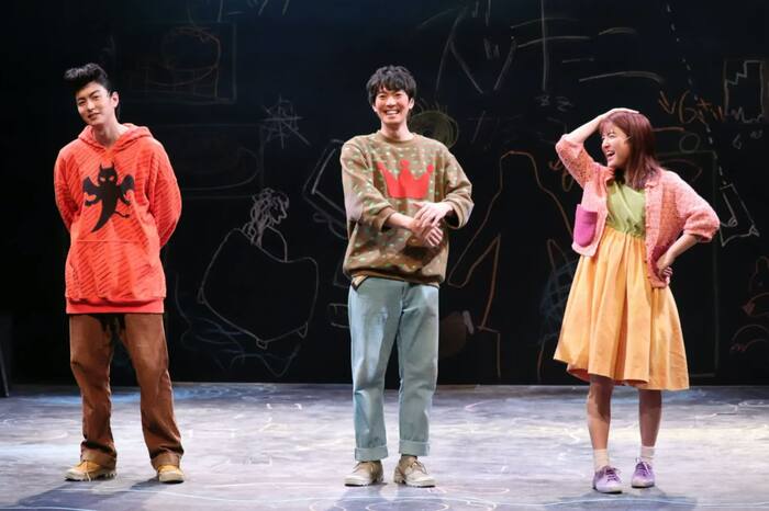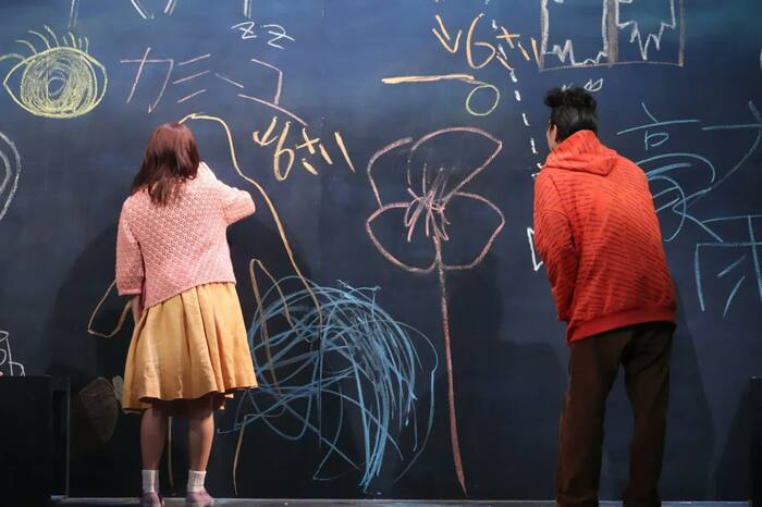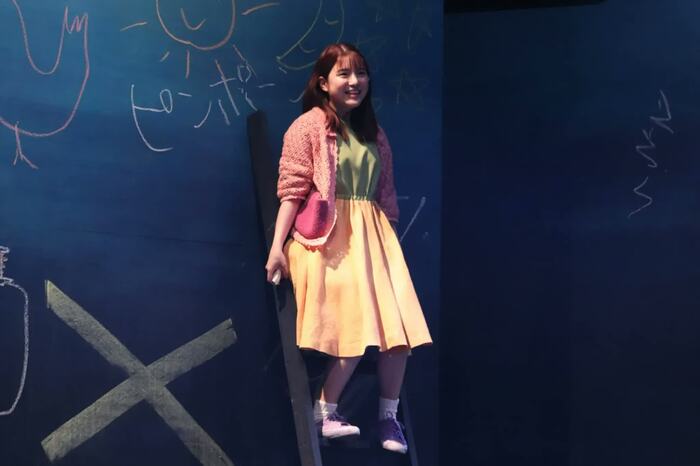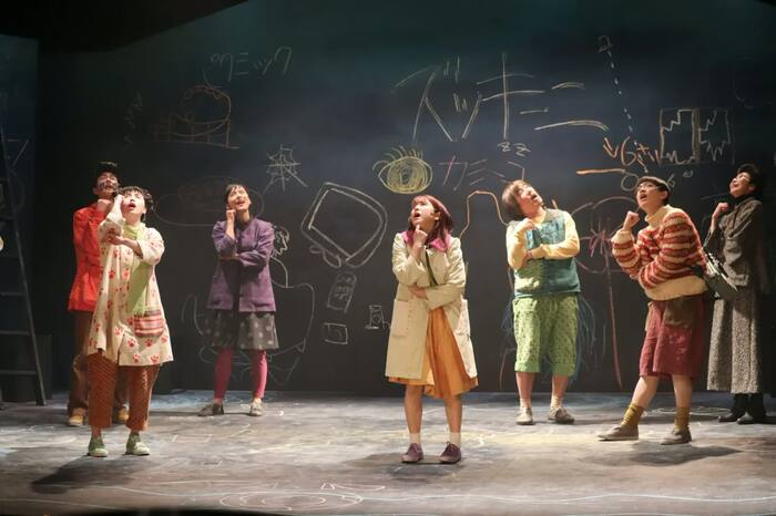 今回、セットが大きな黒板になっていて、演者たちが絵を描いていくという変わった演出に。辰巳は「ノゾエさんが『ブレーキかけず、まず描いてみましょう』と言ってくださって。思ったことをまず描いていくってところから始まりました。チョークの粉まみれになった稽古着が思いです」としみじみ。