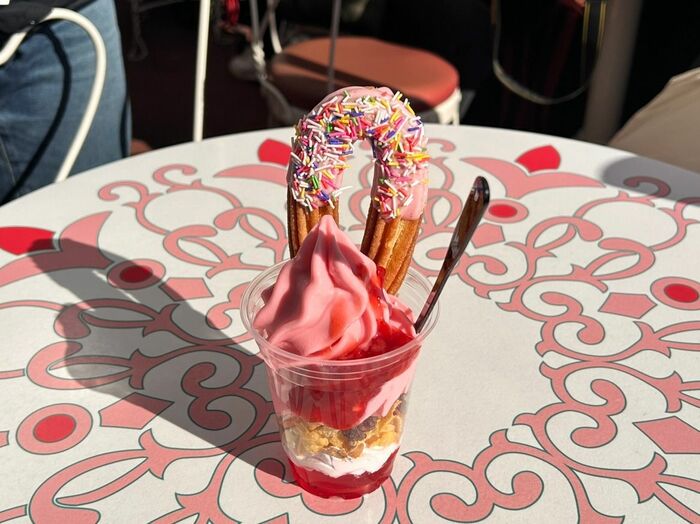 ゼリー、ホイップ、ソフトクリーム、ソース、すべてがストロベリー尽くしです!上に乗ったチュロスの見た目はインパクトがあります。