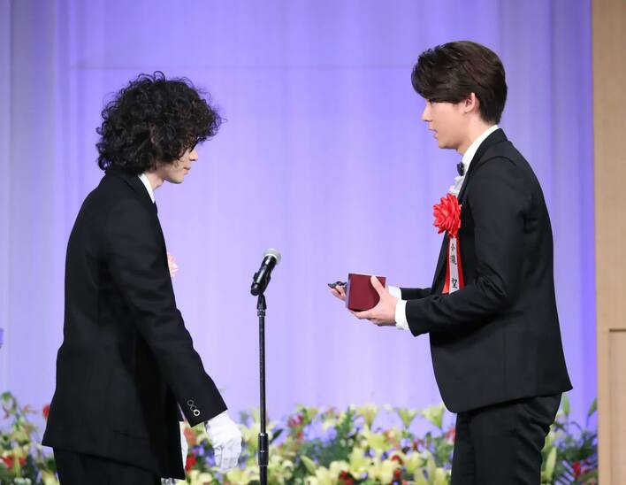 小瀧は、緊張の面持ちでステージへ。菅田からブロンズを受け取り、マイク前に立ちコメントを。