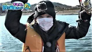 外はあいにくの雪模様で、モモコは持参のマスクにワカサギの絵と「寒さに勝つ!」の文字で気合を入れる。目標の釣果は、5匹!?あまりに少ない目標を50匹に上方修正し、いざ入鹿池へ。