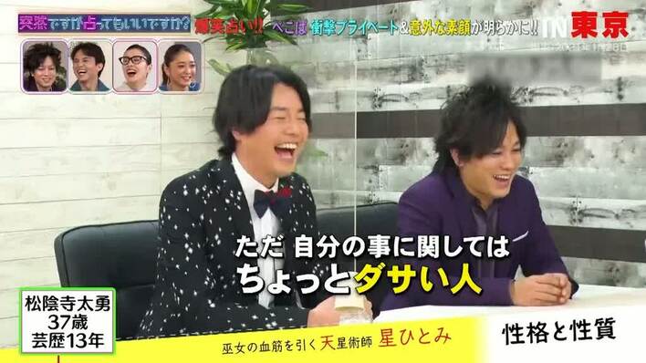 まずはぺこぱの2人の性格について。松陰寺は「上弦の月タイプ。直感力が高く、人を見る目があるが、自分のことに関してはちょっとダサい」と指摘されると、シュウペイは爆笑しながら「私服、めっちゃダサいんですよ」と暴露。