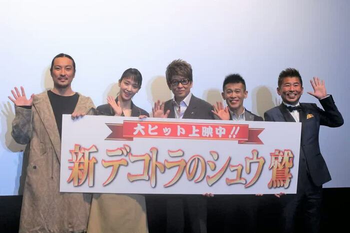 2月23日(火)、映画「新 デコトラのシュウ 鷲」大ヒットよろしく舞台あいさつが都内で行われ、主演の哀川翔、共演の剛力彩芽、新羅慎二(若旦那)、勝俣州和、柳沢慎吾が登壇した。