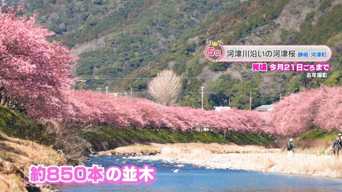 河津桜の原木がある発祥の地になっており、川沿いにはおよそ850本の桜が並んでいます(2月21日ごろまでが見頃)。