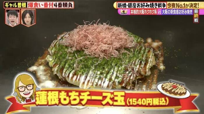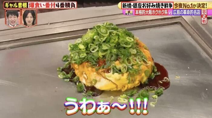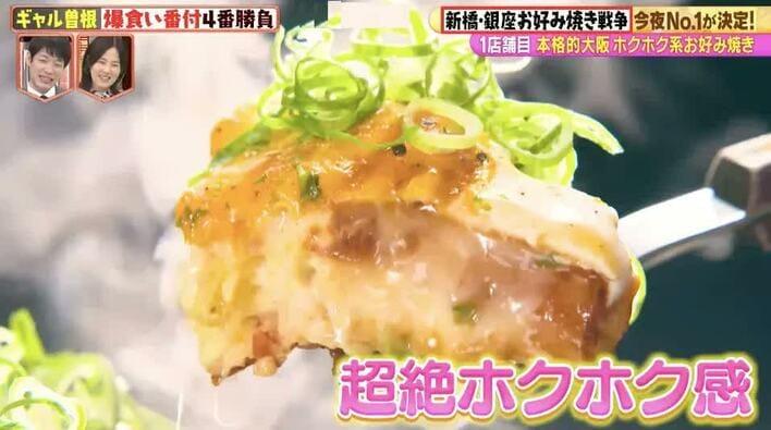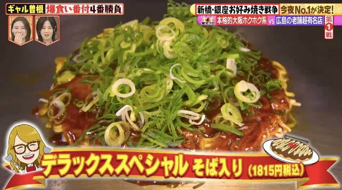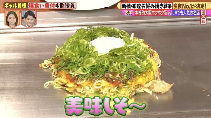 ギャル曽根と彦摩呂、3時のヒロインのかなでが訪れたのは、お好み焼きの名店が集まる東京・新橋&銀座。日本コナモン協会会長の熊谷真菜氏が厳選した5店舗のお好み焼きを3人が爆食いし、勝ち抜き方式でNo.1を決定した。