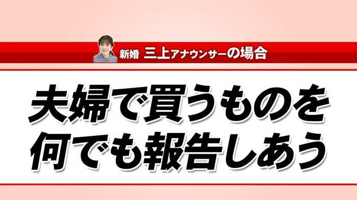 お金を貯めるためには、自分の収入も「自分のお金」ではなく「2人のお金」だと思うことが大事だと語る三上アナ。三木によると、夫婦が別々に“お財布”を持つよりも、三上アナの方法のほうがお金は貯めやすいそうだが、番組公式SNSには「相手には報告してほしいけど、自分の報告はしたくない」という本音が多く見られた。