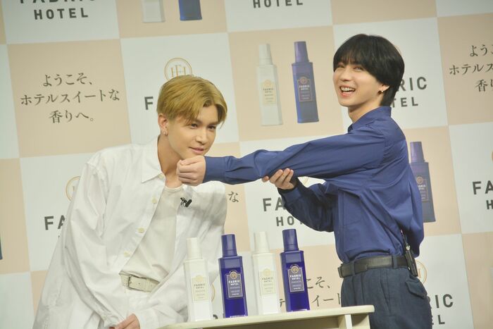 2月14日、新しい柔軟剤ブランド「FADRIC HOTEL(ファドリックホテル)」のCM発表会に、岩田さんと吉野さんが登壇。CMの撮影裏話、「心を満たされる瞬間」を語り、仲良し“先輩・後輩”トークを披露しました。