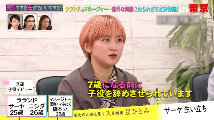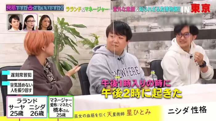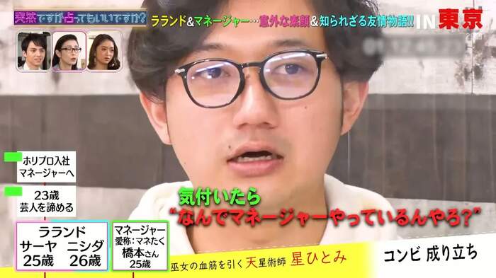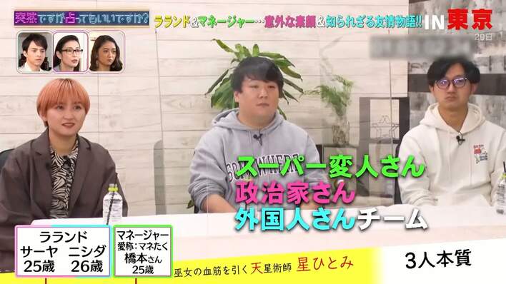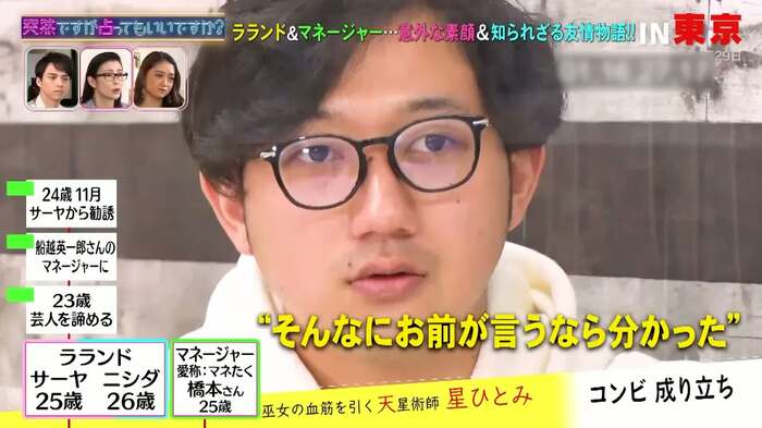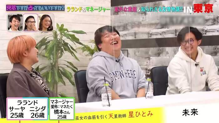 2月17日(水)、フジテレビでは『突然ですが占ってもいいですか?』が放送され、ラランドとマネージャーの橋本拓哉さんが星ひとみによって占われた。