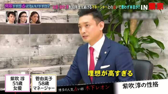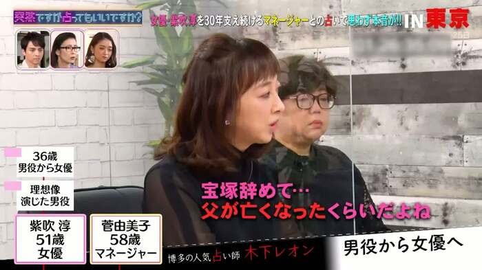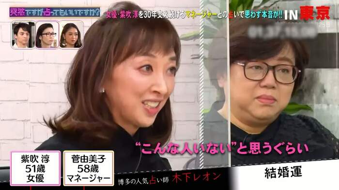 2月17日(水)、フジテレビでは『突然ですが占ってもいいですか?』が放送され、紫吹淳とマネージャーの菅由美子さんが木下レオンによって占われた。