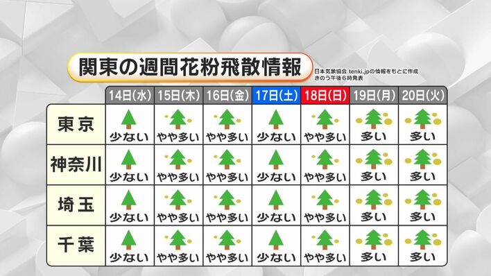 花粉の飛散情報もこれに比例するように、15日(木)には「やや多い」飛散量に。