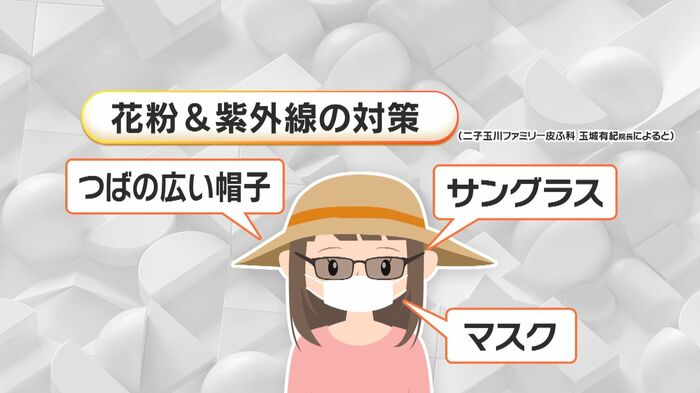 二子玉川ファミリー皮ふ科の玉城有紀院長によると、つばの広い帽子やサングラス、マスクなどを着用し肌を守ることが、花粉と紫外線の両方に効果的だといいます。
