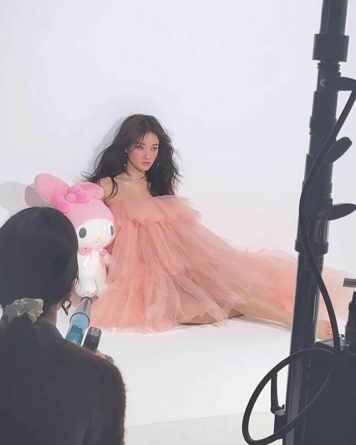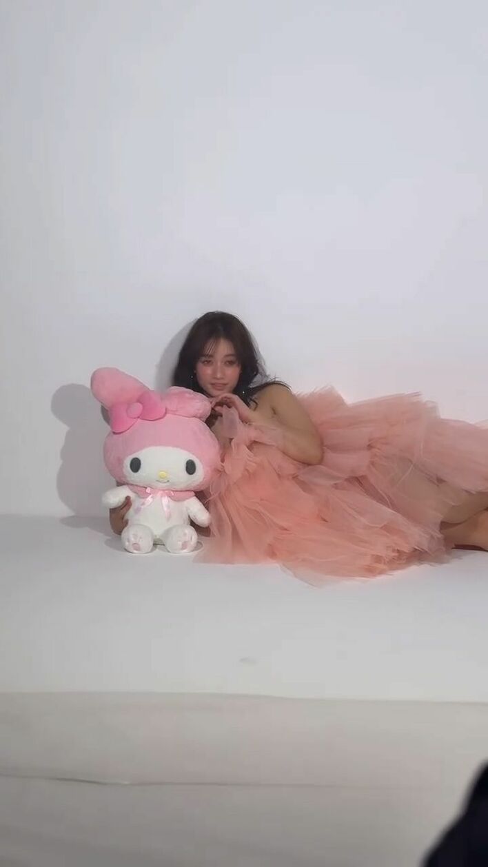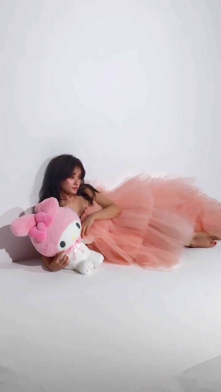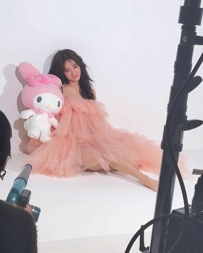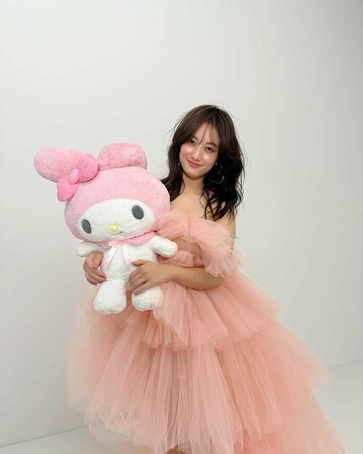 谷まりあ デコルテ際立つチュールドレス姿でサンリオぬいぐるみ“ギュー!”「見惚れてしまいます」「どっちがマイメロですか」