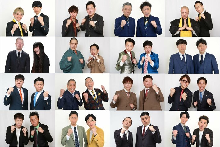 上段左から)祇園、マシンガンズ、モンスターエンジン、ドドん/2段目左から)金属バット、リニア、母心、吉田たち/3段目左から)ハンジロウ、ザ・ぼんち、タモンズ、囲碁将棋/4段目左から)はりけ~んず、ヘンダーソン、ななまがり、ツートライブ