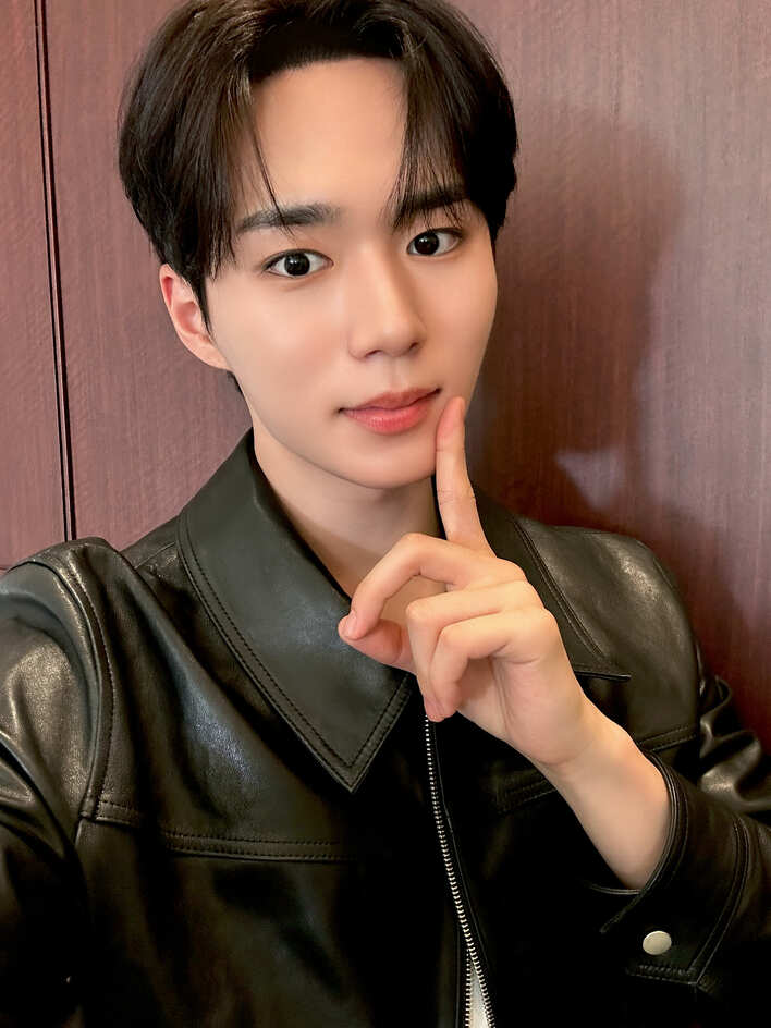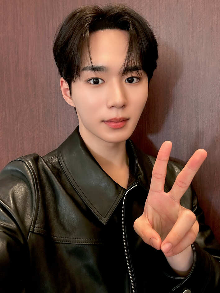 “秘密”のポーズをしてセルカを撮るキム・ジュンソ