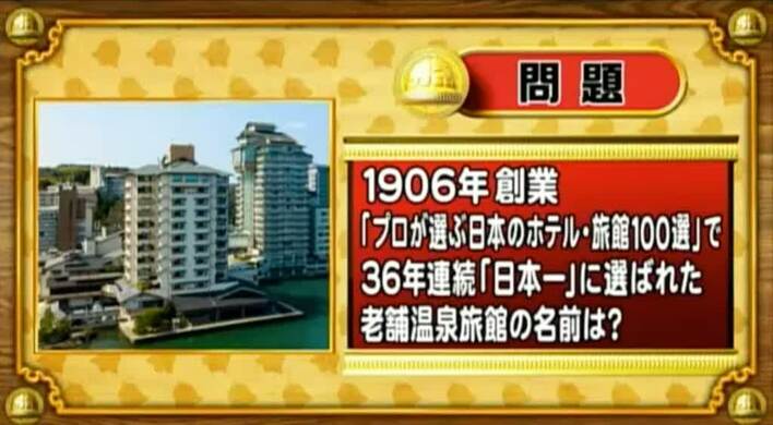 <『脳ベルSHOW』クイズ>1906年に創業、36年連続日本一に選ばれた老舗温泉旅館の名前は?