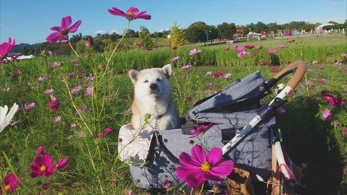 花と記念撮影するククリちゃん 提供:くーさんママ