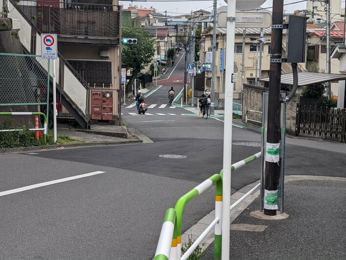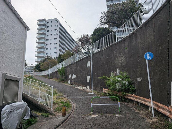画面手前から奥にかけて一度下り坂になり、その奥は上り坂に
