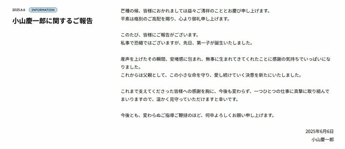 NEWSメンバー初のパパに!小山慶一郎 第1子誕生を発表「愛し続けていく決意を新たに」妻はAAA宇野実彩子【コメント全文】