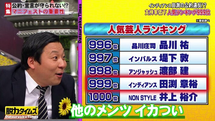 番組の調査では、田渕さんの人気芸人ランキングは999位!