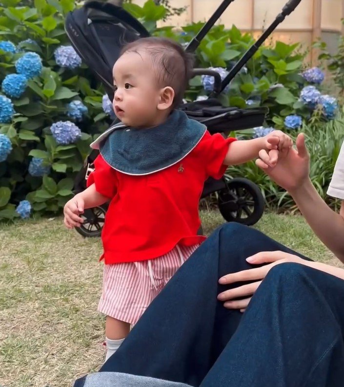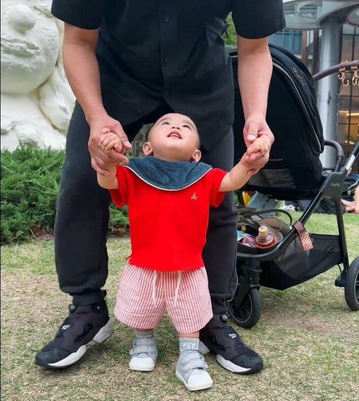 「成長があっという間!」井戸田潤の妻・蜂谷晏海が0歳息子“ベビバーグ”のお靴デビュー報告 「天使」「ハンバーグ師匠2世!」