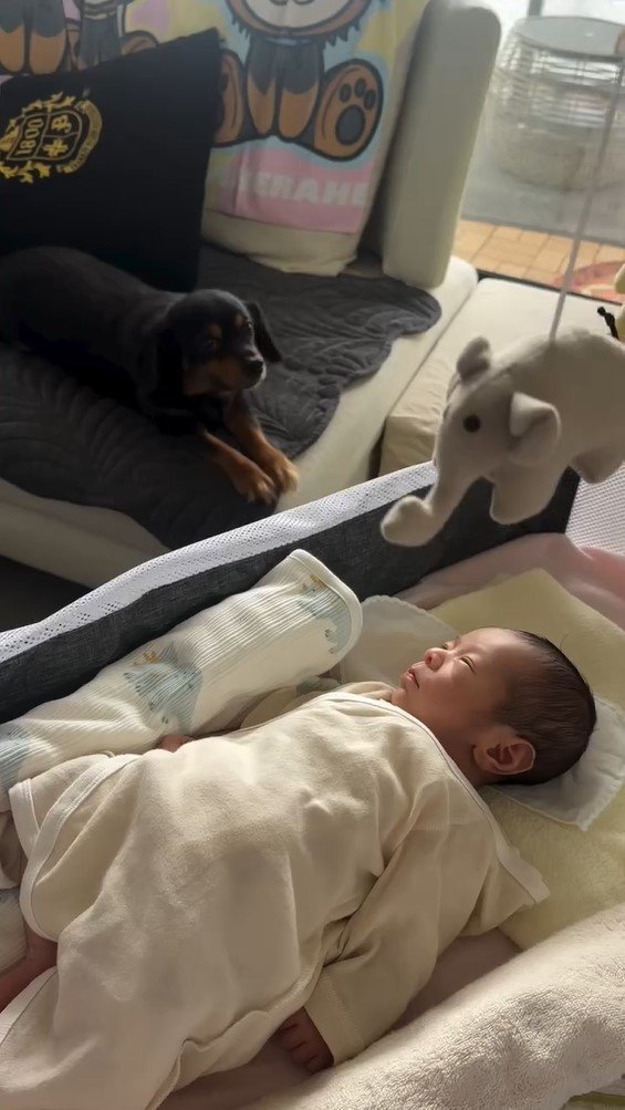 「全てが尊い」ヘラヘラ三銃士・ありしゃん 双子の赤ちゃんと愛犬が感動の初対面!「かわいすぎる 泣ける」と反響