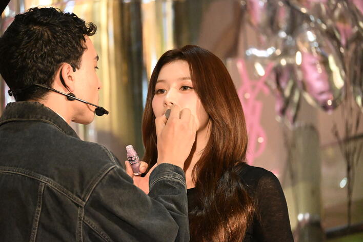 TWICE・SANA 表参道に全身黒のミニ丈コーデで登場!その場でリップを塗られるシーンも YSL BEAUTYポップアップイベント