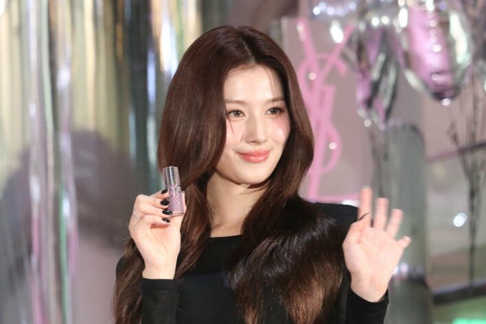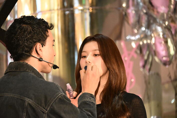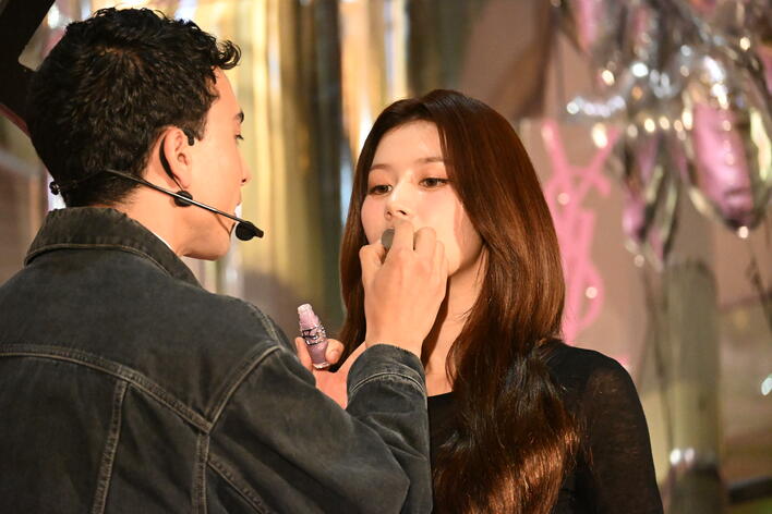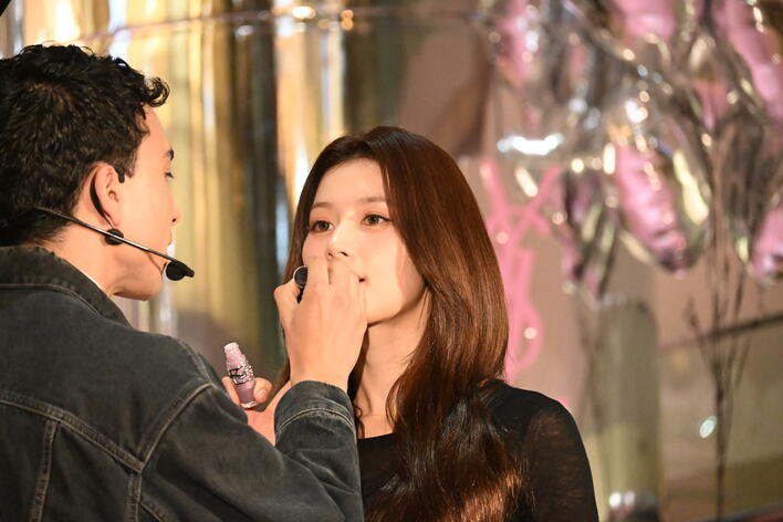 TWICE・SANA 表参道に全身黒のミニ丈コーデで登場!その場でリップを塗られるシーンも YSL BEAUTYポップアップイベント