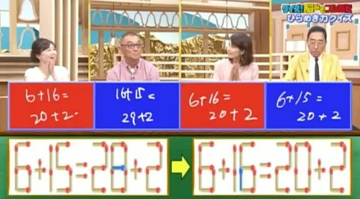 <『脳ベルSHOW』クイズ>式を成立させるために動かすべきマッチはどれ?