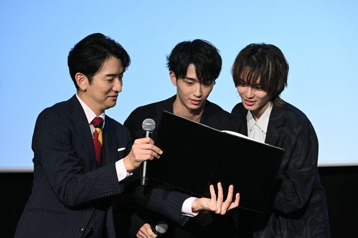 名シーン再現のため、生田竜聖アナから台本を見せてもらう金子隼也&野村康太