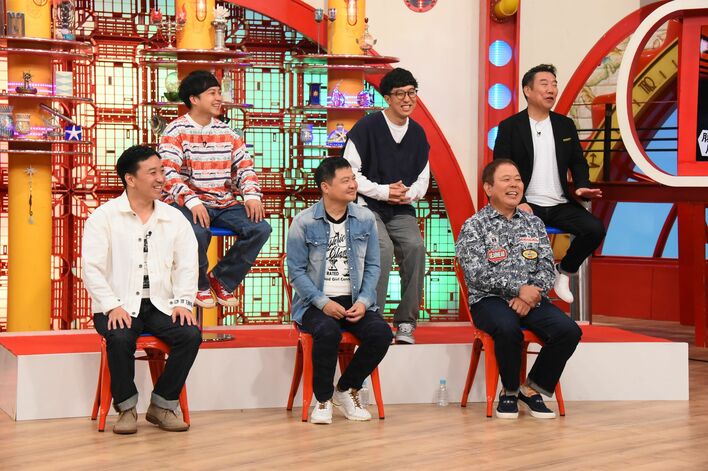 左から)月亭八光、ピーナツ、月亭方正、ドーナツ、ほんこん、メッセンジャーあいはら