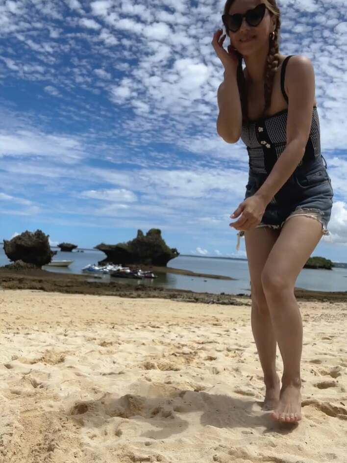 「スタイル抜群」MAX・LINA(48) ショーパンから美脚のぞかせ沖縄のビーチを散歩!ノンアルで“チル”する様子に「太陽より眩しい」
