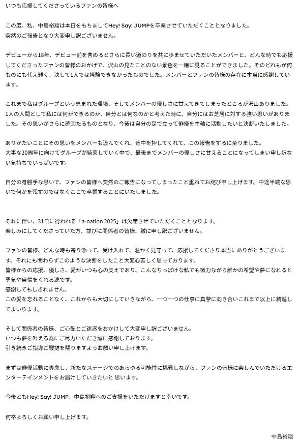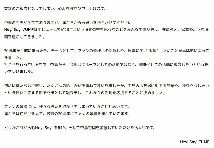 Hey! Sɑy! JUMP・中島裕翔がグループ卒業「今後は自分の足で立って」 メンバーからは「初めは僕たちも戸惑い」