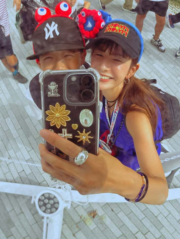 スザンヌ 念願の万博を親子で満喫!息子との自撮り2ショットに「ママにそっくり」ミャクミャクカラーの万博コーデも披露