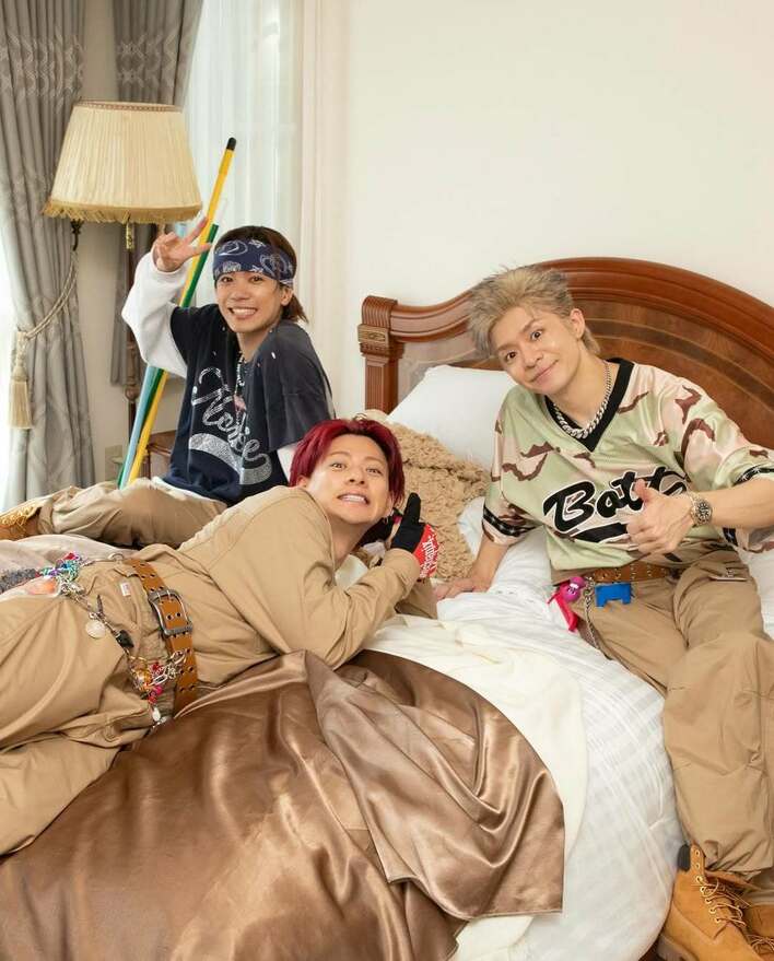 岸優太 上目遣いで小顔際立つ“頬ハート”披露!平野紫耀&神宮寺勇太とベッドの上で…「3人一緒は最強」