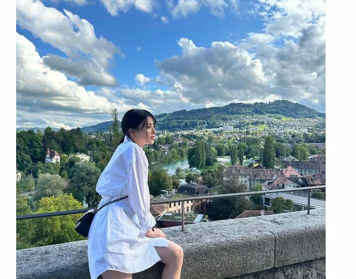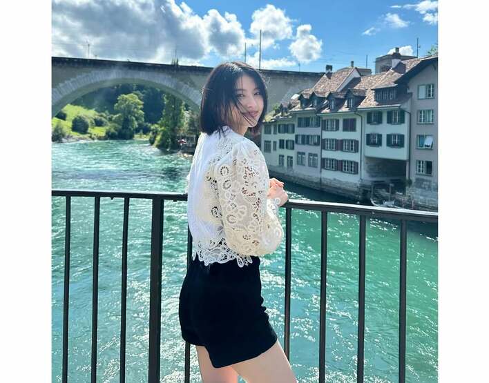 出口夏希 タイトなワンピース姿で大はしゃぎ!「自然よりも透明感が!」ショート丈コーデでニッコリ振り返る姿などスイス&フランス満喫