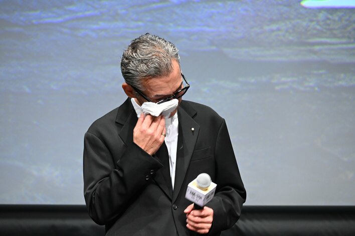 ハンカチで涙をぬぐう渡部篤郎