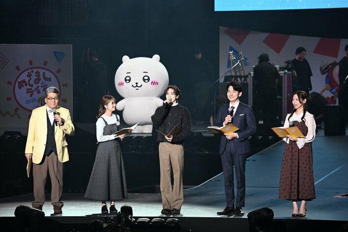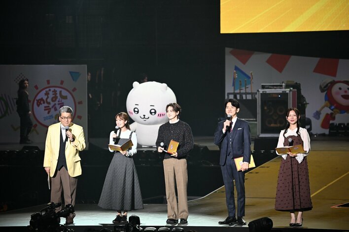 左から)軽部真一アナ、井上清華アナ、HOKUTO、生田竜聖アナ、小山内鈴奈アナ